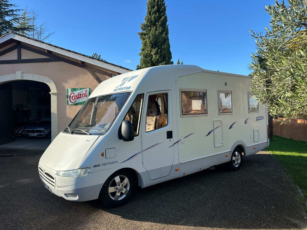 Camping car intégral AUTOSTAR ARYAL sur base de FIAT DUCATO 2,8L JTD 146cv, 4 places sur carte grise, 5 couchages, 9cv fiscaux, factures d'entretien disponible, courroie de distribution à jour, vidange moteur avec les filtres GO, huile et air effectués, Télé satellite, frigo freezer, tri mixte, chaudière, porte vélo, WC, 3 feux gaz, panneaux solaire, auvent, climatisation, douche….